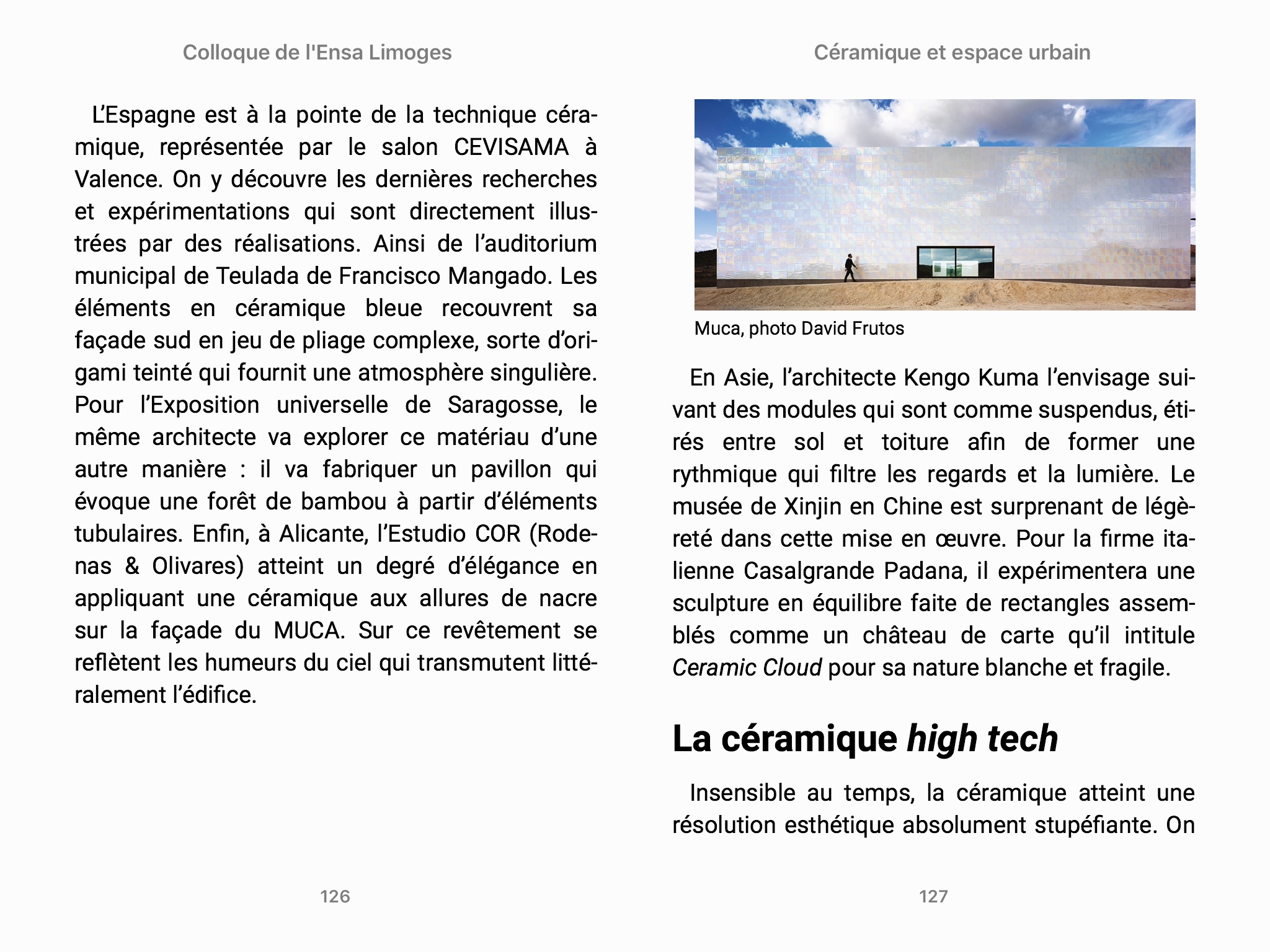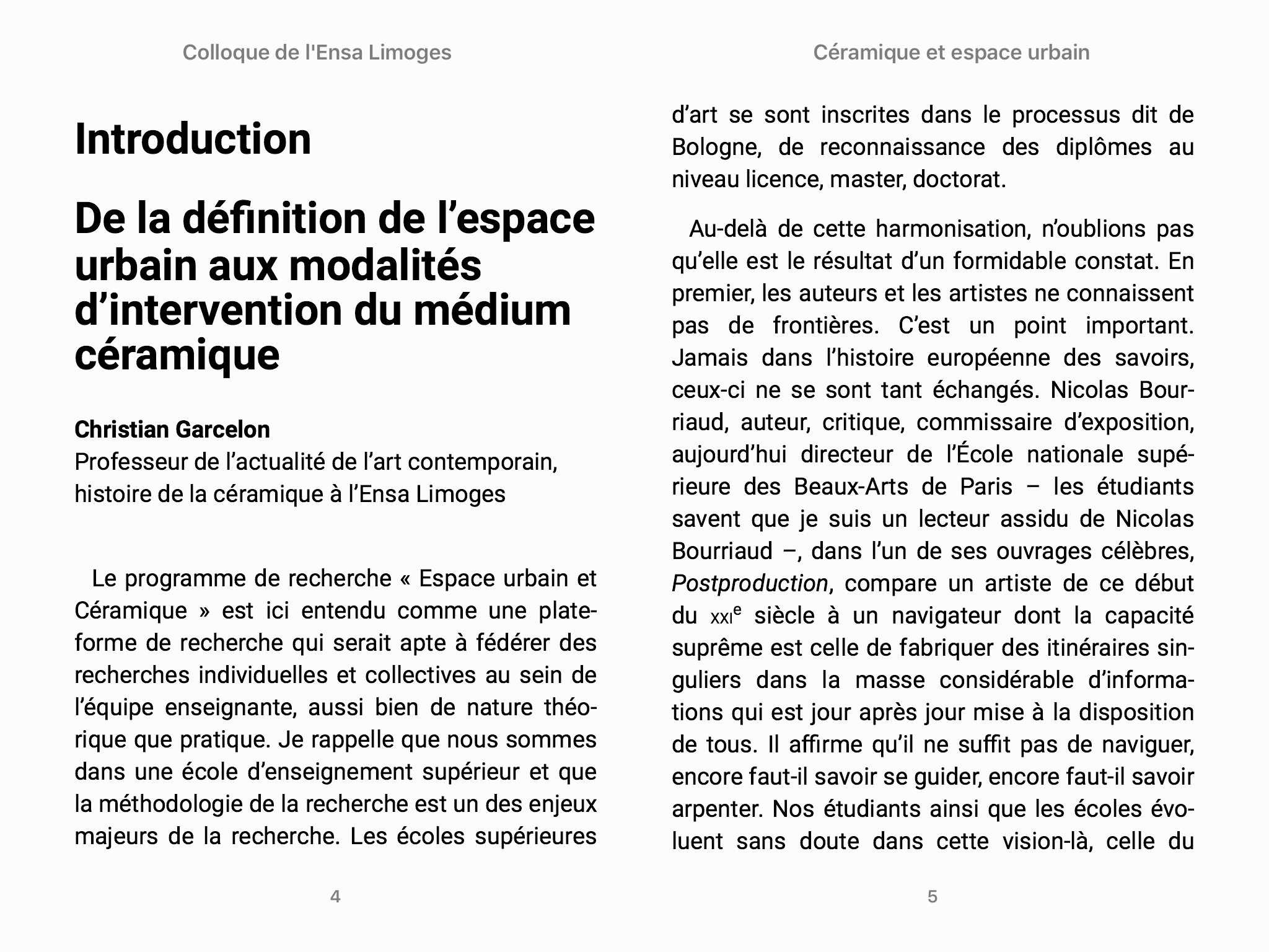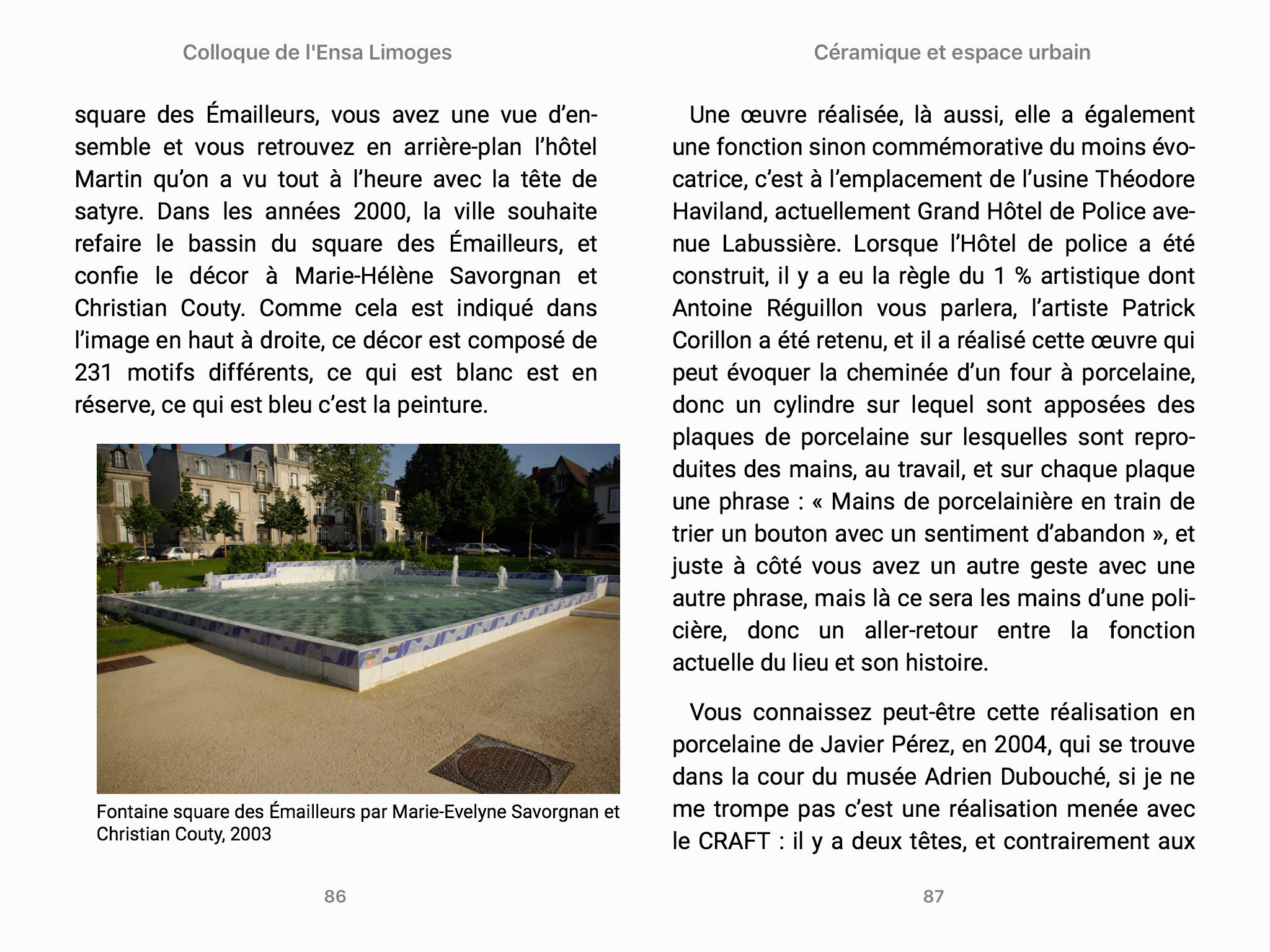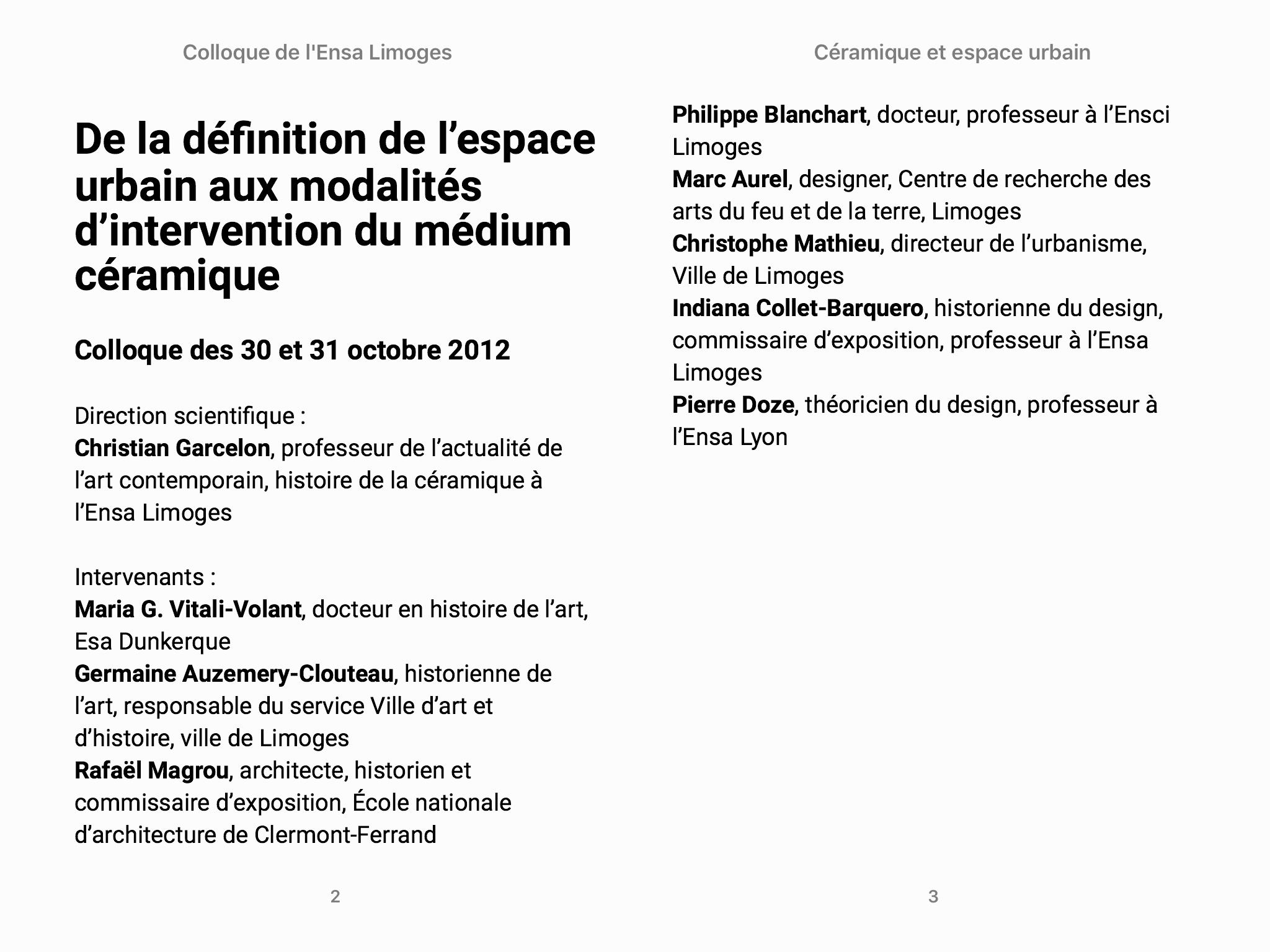 Cet ouvrage est le condensé des réflexions et expériences réalisées à l’Ensa Limoges entre 2011 et 2014 autour de l’axe de recherche « céramique et espace urbain ». Les travaux se sont articulés entre colloque, ateliers des artistes du post-diplôme « kaolin » et projet de réalisation de mobilier urbain avec l’intervention d’Andrea Branzi. L’ouvrage retrace les contributions au colloque « De la définition de l’espace urbain aux modalités d’intervention du médium céramique » et éclaire les expériences pratiques réalisées.