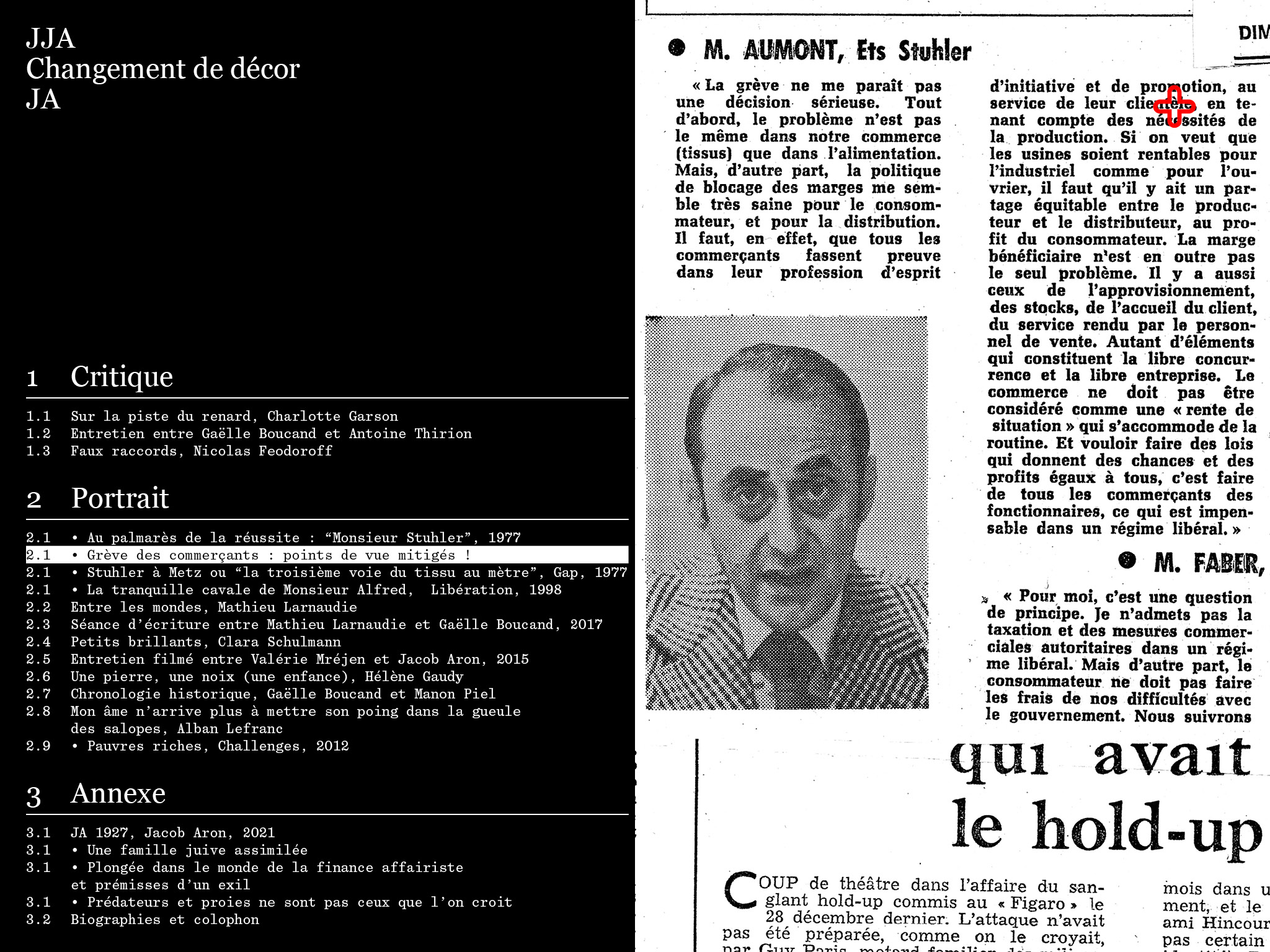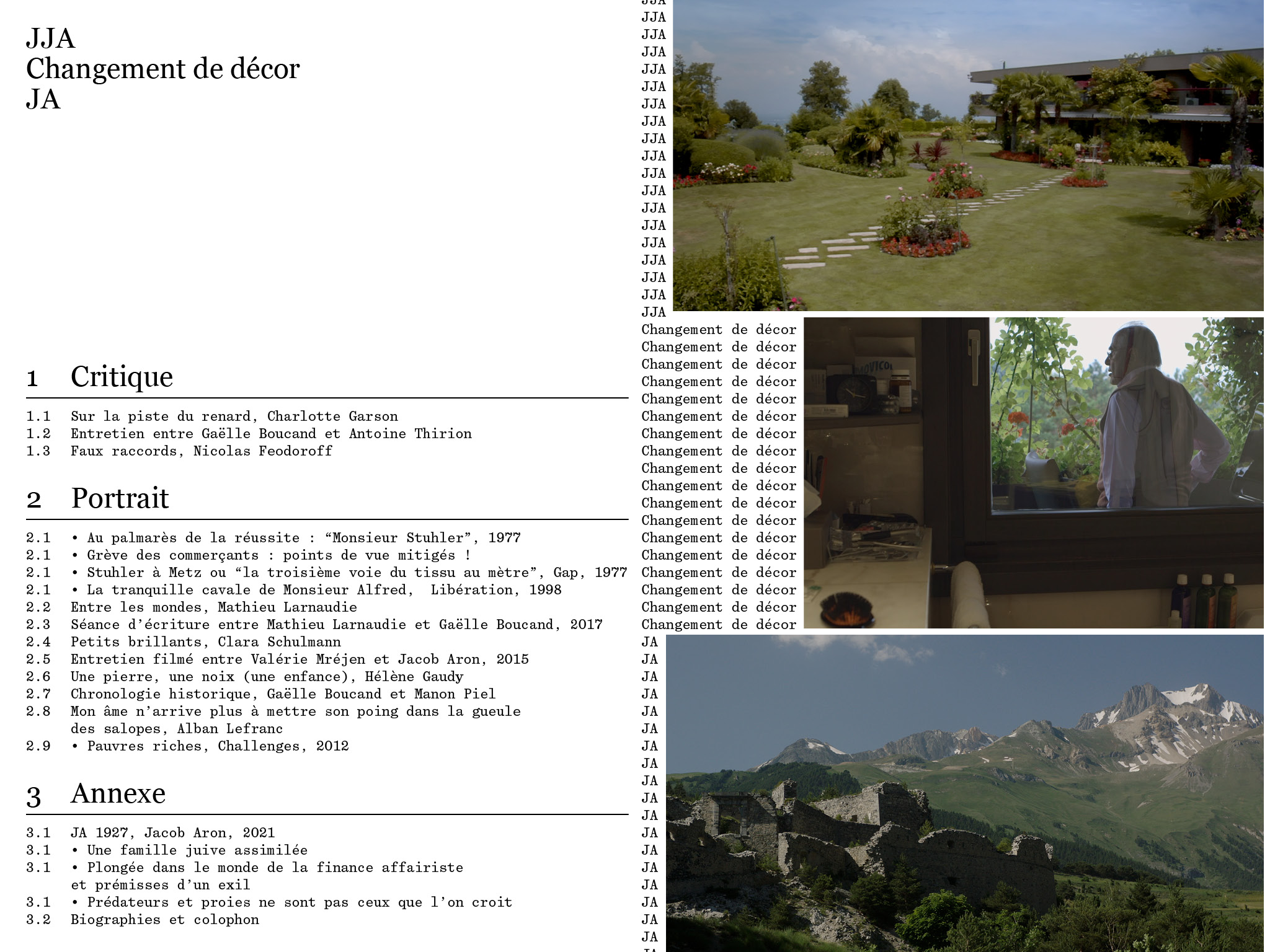Les trois films de Gaëlle Boucand — JJA, Changement de décor, JA — dressent un portrait protéiforme d’un personnage ambivalent, emblématique du XXe siècle. Enfant juif caché en France pendant la Seconde Guerre mondiale, JJA (ce sont ses initiales) a petit à petit gravi les échelons (selon l’une de ses formules), de vendeur de chaussures dans les Alpes à la sortie de la guerre jusqu’à devenir gérant de fortune et s’exiler en Suisse où il vit depuis vingt-cinq ans, dans une grande villa qu’il a lui-même baptisée Rosebud. À partir de cette trilogie, la présente édition réunit différents types de textes et de documents, apportant une pluralité d’interprétations et de perspectives sur les films, leur protagoniste et son histoire. Cette diversité des points de vue et des pratiques convoquées (de critiques, d’écrivain·e·s, de journalistes, d’artistes) produit une contamination entre les récits, des plus factuels aux plus spéculatifs. En prolongeant le geste initié par les films, cet ensemble kaléidoscopique vient ainsi diffracter encore davantage « ce portrait en mille morceaux ».