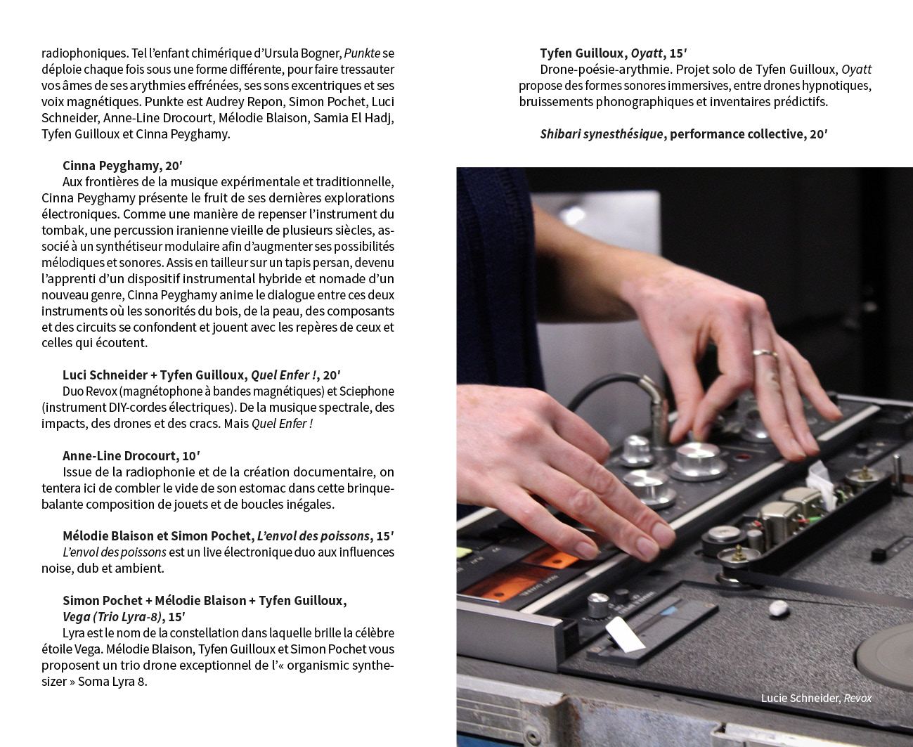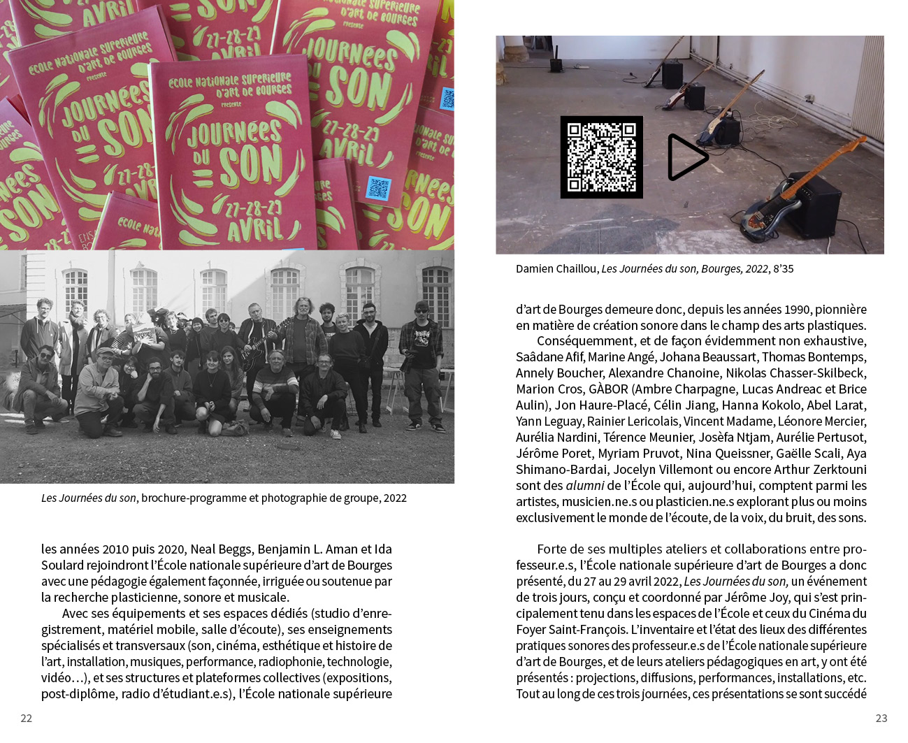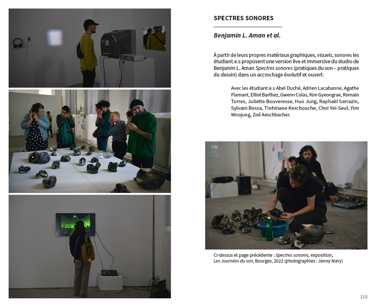 Avec des propositions monographiques de : Benjamin L. Aman, Carla Beaumatin, Neal Beggs, Érik Bullot, Alexandre Castant, Ambre Charpagne, Florence Chevallier, Cécile Colle}{Ralf Nuhn, Magali Desbazeille, Anaïs Dunn et Stéphane Joly, Ferenc Gróf, Stéphanie Jamet, Jérôme Joy, Tatiana Komaroff, Aurélien Krafft, LASSO (Association étudiante de l’École nationale supérieure d’art de Bourges), Ingrid Luche, Jean-Michel Ponty, Myriam Pruvot, Punkte (post-diplôme Arts & créations sonores), Nina Queissner, Sofia Quintero, Talla Thiam, Antonin Verhulst, Li Xinran et Sonia Gassemi, Liu Yaonan, Jonathan Zwaenepoel.