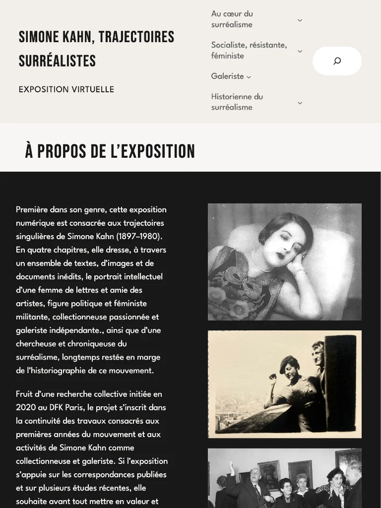 Première dans son genre, cette exposition numérique est consacrée aux trajectoires singulières de Simone Kahn (1897–1980). En quatre chapitres, elle dresse, à travers un ensemble de textes, d’images et de documents inédits, le portrait intellectuel d’une femme de lettres et amie des artistes, figure politique et féministe militante, collectionneuse passionnée et galeriste indépendante, ainsi que d’une chercheuse et chroniqueuse du surréalisme, longtemps restée en marge de l’historiographie de ce mouvement.