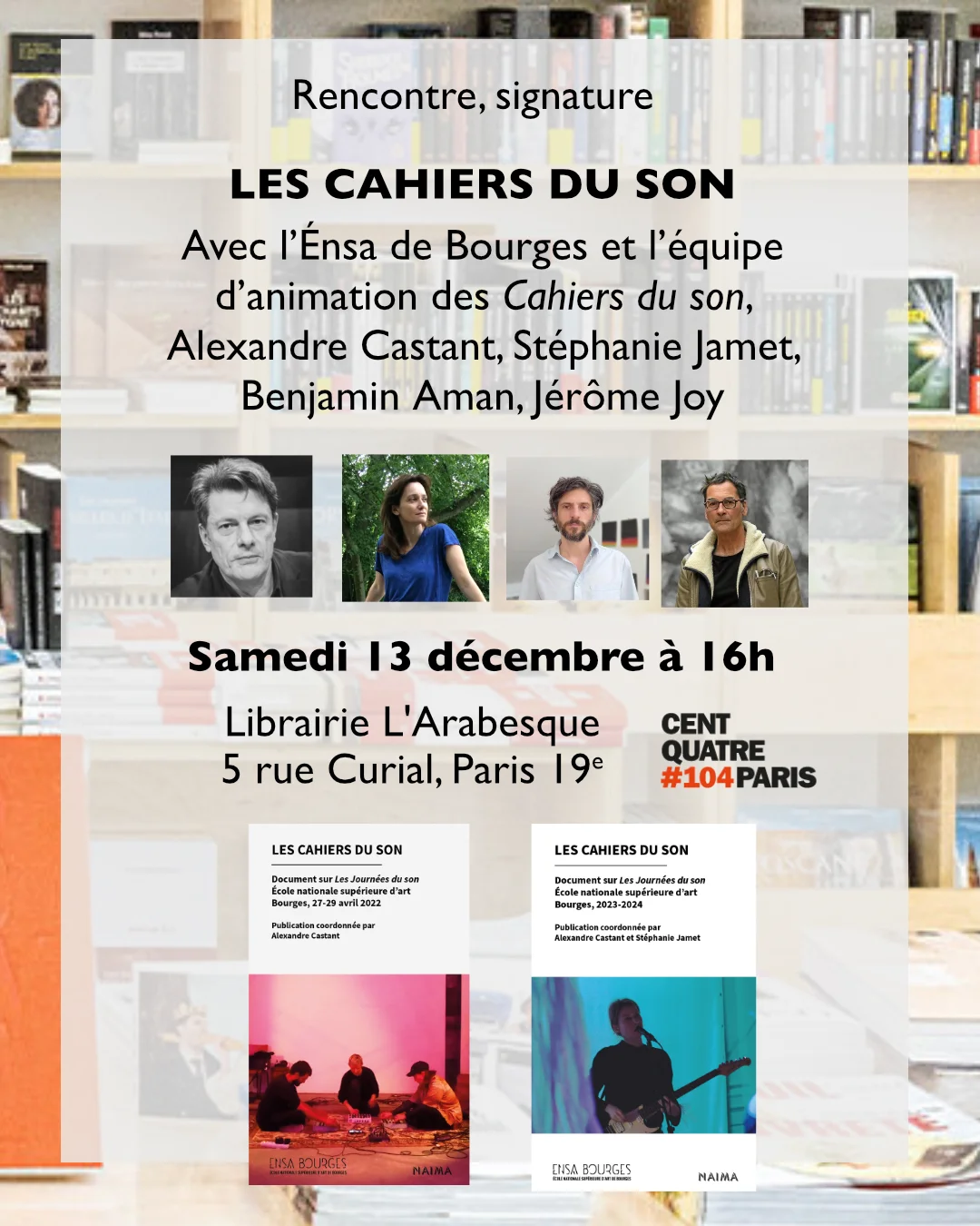 Rencontre avec l’équipe d’animation des Cahiers du son, Alexandre Castant, Stéphanie Jamet, Benjamin Aman, Jérôme Joy à la librairie du CENT-QUATRE, samedi 13 décembre à 16h