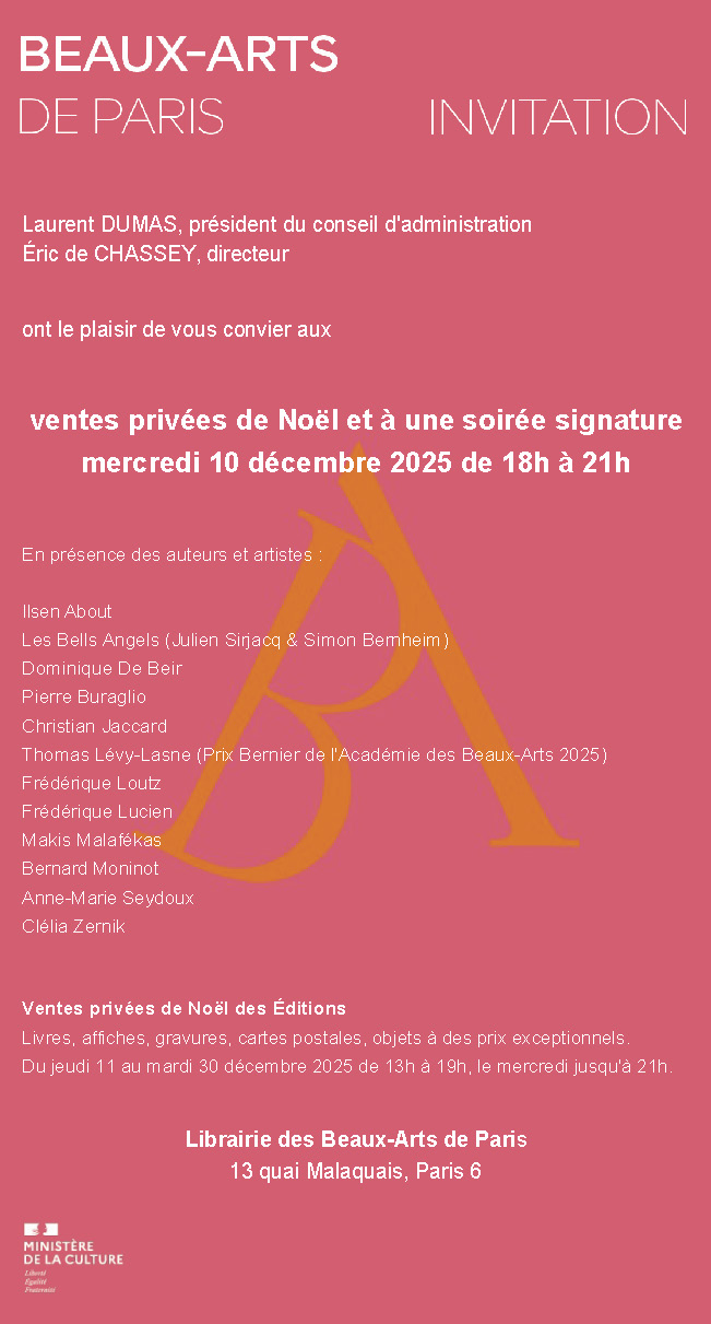 “Dans l’atelier d’Éric Seydoux” Librairie des Beaux-Arts de ParisPalais des Beaux-Arts13 quai Malaquais, Paris 6 Mercredi 10 décembre de 18h à 21h Signatures et rencontre avec l’équipe éditoriale de la monographie et des artistes compagnons d’Éric Seydoux.