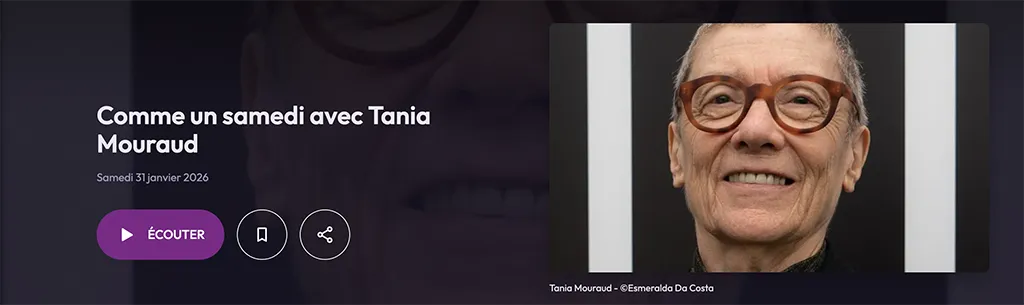 Arnaud Laporte donne carte blanche à Tania Mouraud dans son émission “Comme un samedi” du 31 janvier sur France Culture. Autour d’elle, Étienne Ghys, mathématicien, Chantal Colleu-Dumond, directrice du Domaine de Chaumont-sur-Loire, Dhafer Youssef, compositeur, chanteur et oudiste, et Alexandre Castant, écrivain et critique d’art. L’émission est disponible ici sur le site de France Culture Lire la suite…