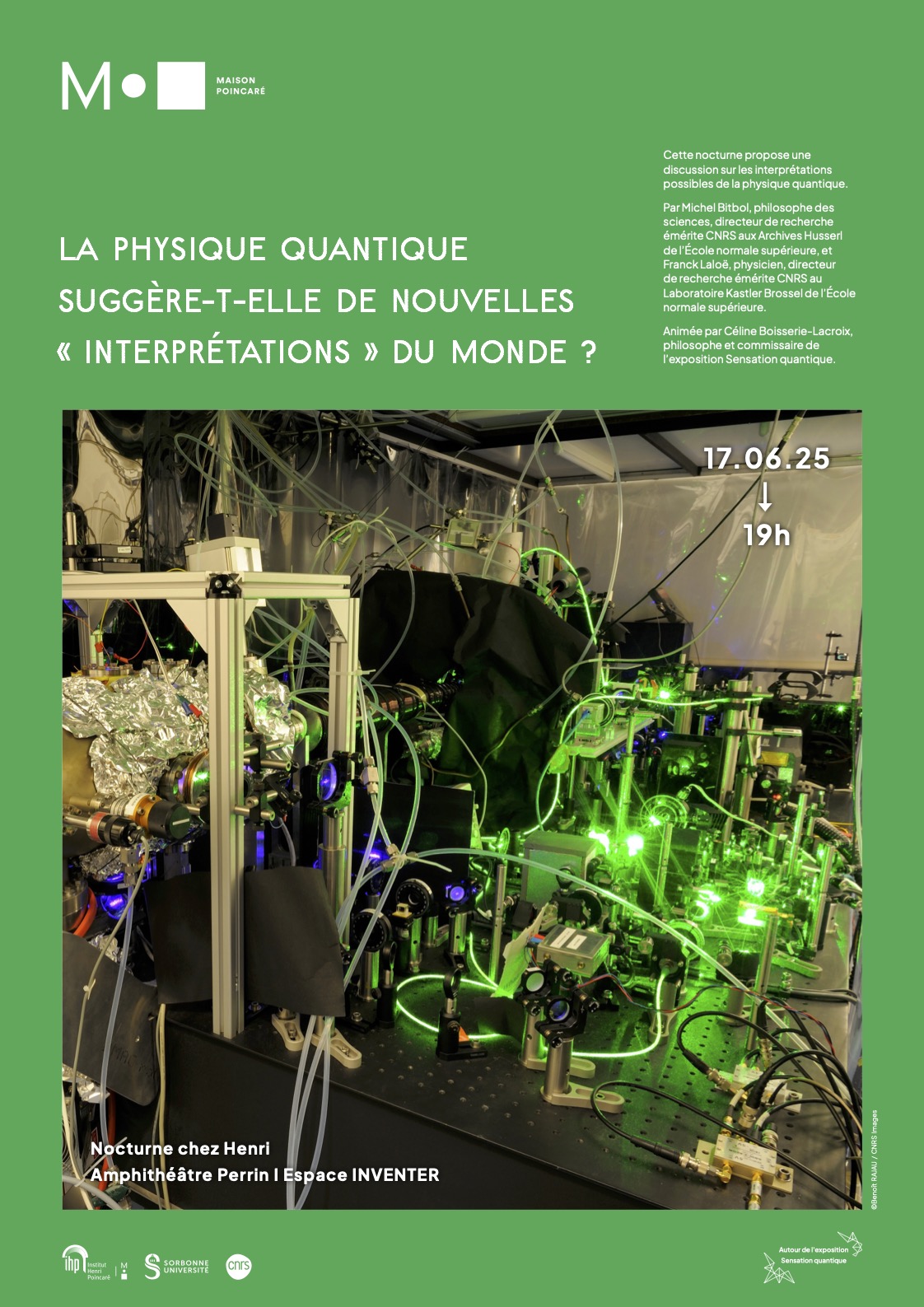 Dans le cadre de l’exposition Sensation quantique à la Maison Poincaré, la Nocturne chez Henri le 17 juin 2025 à 19h propose une discussion sur les interprétations possibles de la physique quantique. Par Michel Bitbol, philosophe des sciences, directeur de recherche émérite CNRS aux Archives Husserl de l’École normale supérieure, et Franck Laloë, physicien, directeur Lire la suite…