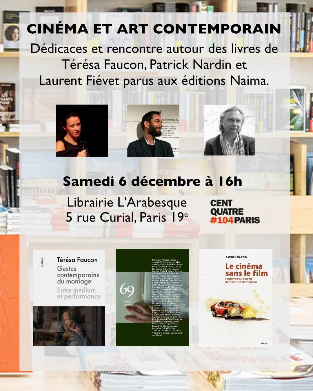 L’Arabesque, librairie du CENT-QUATRE et les Éditions Naima proposent une rencontre consacrée à trois ouvrages qui interrogent, chacun à leur manière, les relations entre art contemporain, cinéma et image en mouvement.